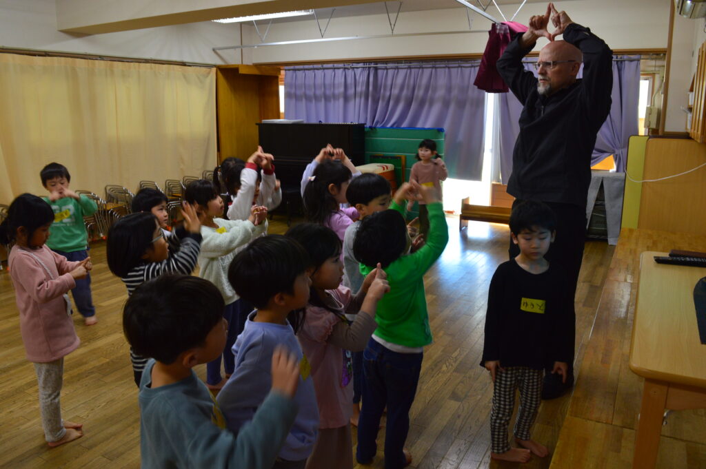 4・5歳児クラスの子どもたちは、すでに先生とも顔なじみで、すっかり仲良しです。玄関で先生の顔が見えると「ベンジャミン先生きたっ!」『グッドモーニング!』と元気にあいさつをしたり、さまざまな英語の単語に触れたりしながら、笑顔いっぱいで活動を楽しんでいました。