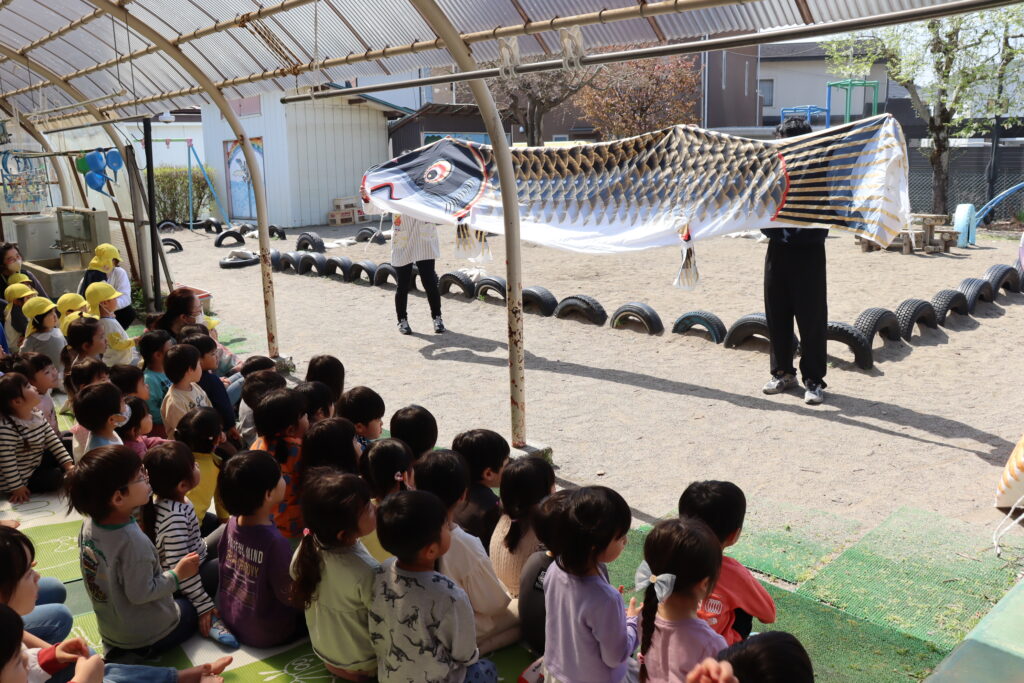 『どうしてこいのぼりって言うのかな?』『どんな意味があるんだろう…』と先生のお話に耳を傾け、こいのぼりの登場を心待ちにする子ども達。先生達の何倍も大きいこいのぼりが目の前に広げられると、『うわぁ~でっか~い!』『これがまごいかぁ~』と歓声が。5月5日は男の子の節句ですが、保育園では女の子も含め、『みんながこいのぼりのように逞しく、元気に大きくなれますように♡』と子ども達み~んなの健やかな成長を願って飾ります。