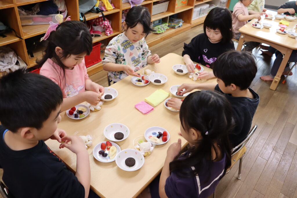 「どれからにしようかな」「なんかうさぎみたいになった!』と、一人ひとりが思い思いに飾りつけをし、世界にひとつだけのオリジナルパフェが完成しました。
